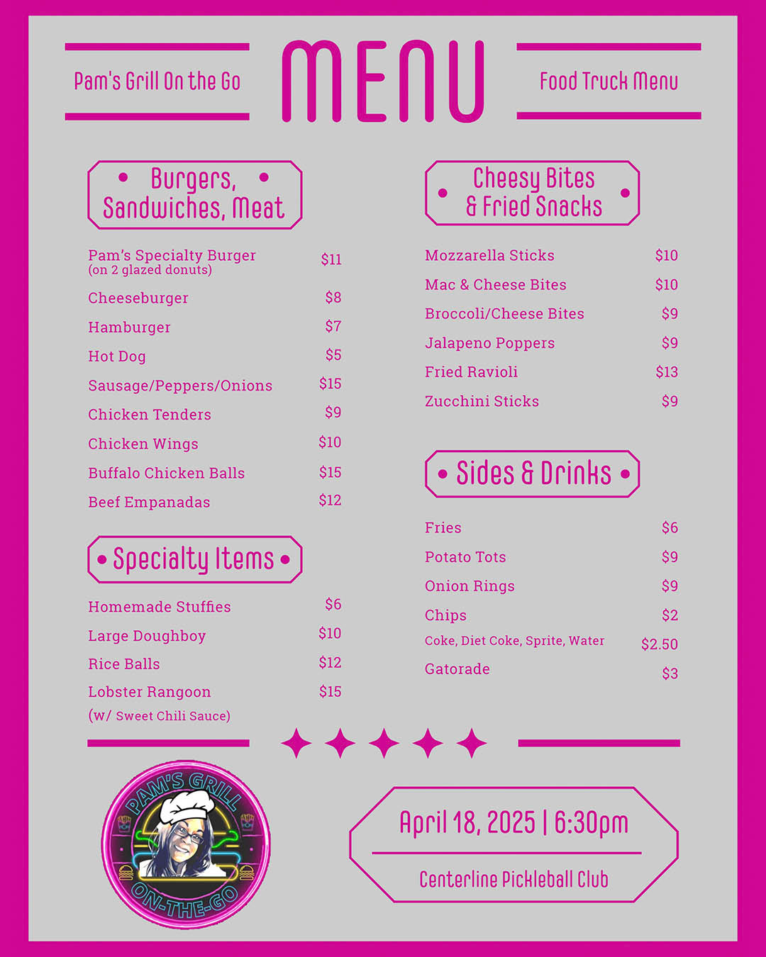 Flyers, Event promos and Food Truck menus.